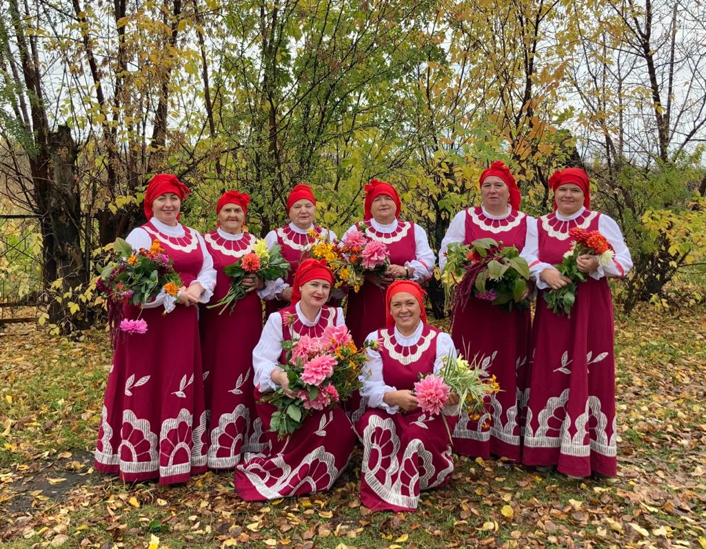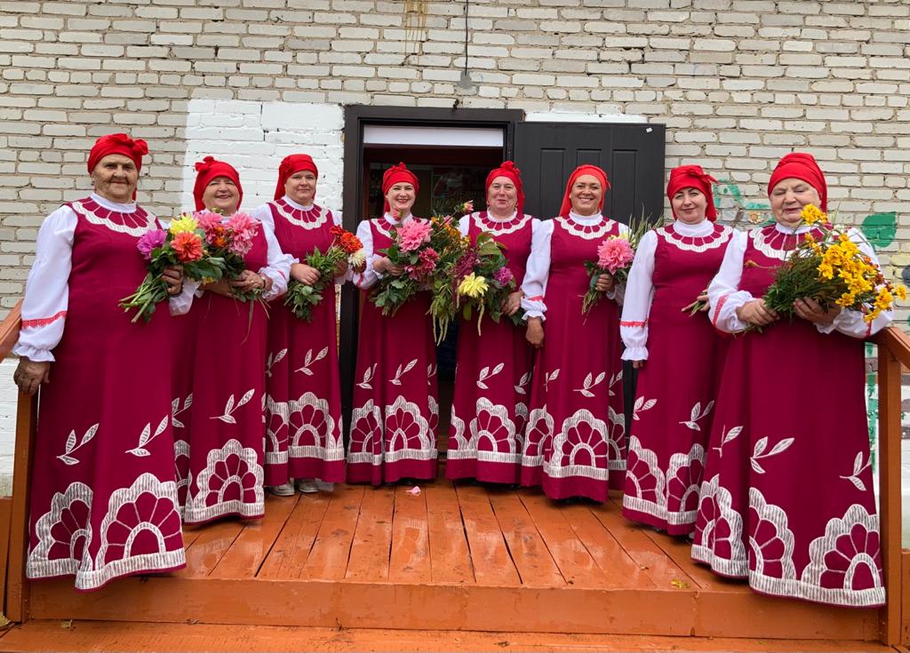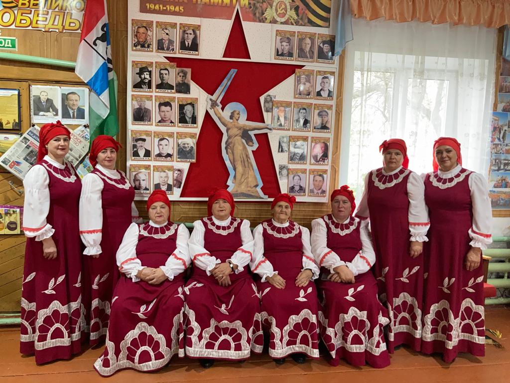 Это список слева на право. Одна приболела и на фото ее нет — это Стяжкина Галина начинали петь сначала в чем придем из дома, потом нам отдали старые костюмы. Мы их немного переделали и немного обновили. Купили ткань сами сшили блузки потом еще купили и сшили сами, прям в клубе летние костюмы. В шитье костюмов нам помогла наша сельчанка, Иванова Лида. Вся тяжелая работа по пошиву легла на нее, но она прекрасно справилась. Это песня называется «От героев былых времен», в связи с пандемией мы не поехали на конкурс «Поющая Россия» и всем сказали выслать просто видео и песня должна была военная в связи 75- летие победы, вот как то кратко…